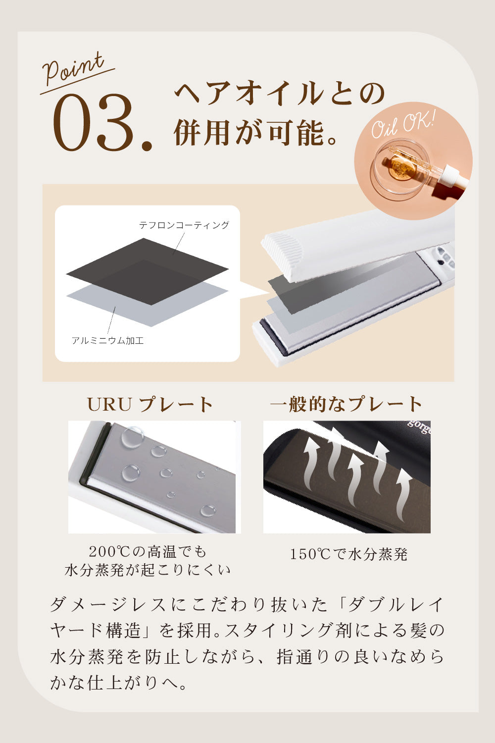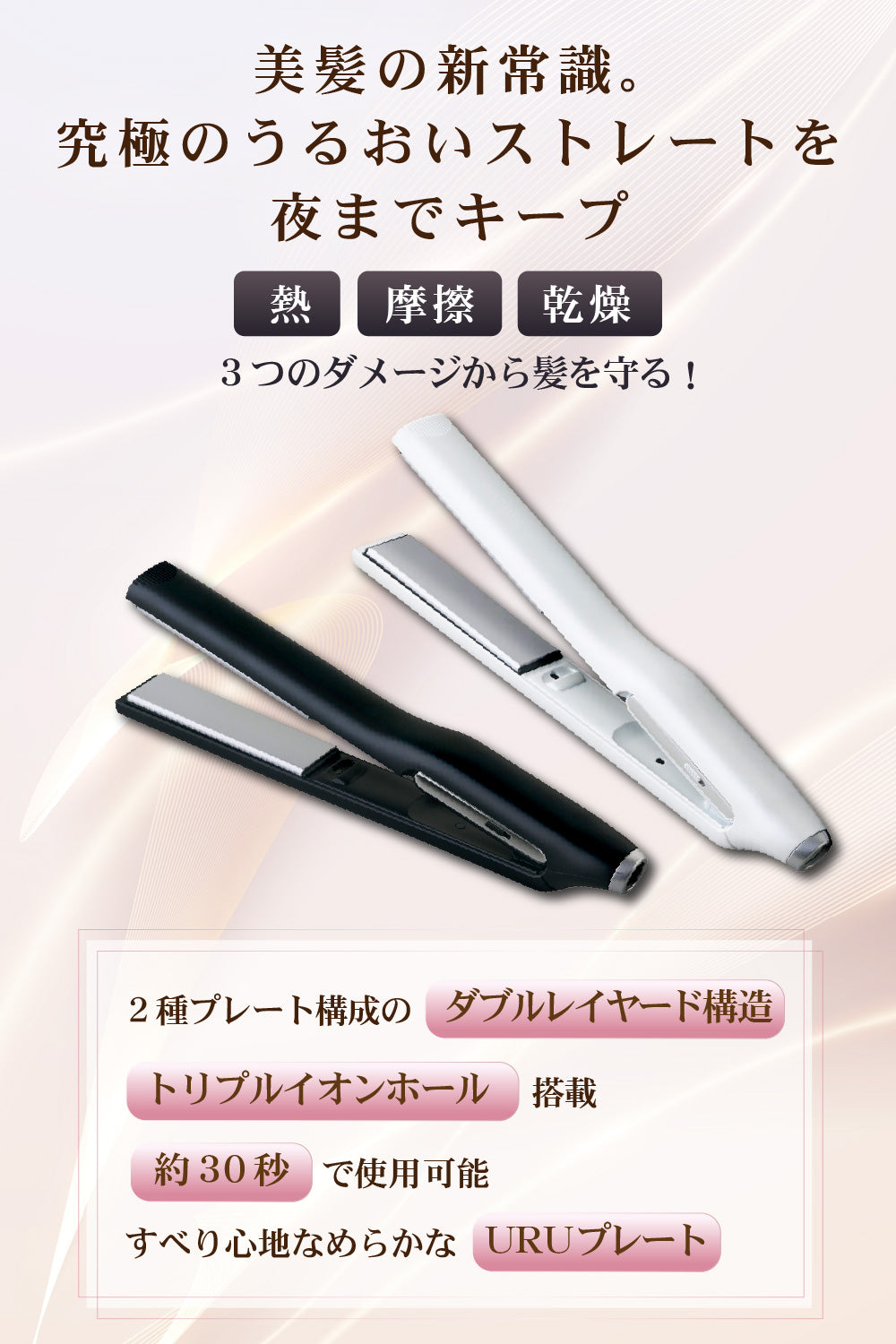 髪の水分が蒸発しにくいURUプレート搭載で、ダメージを抑え使うたびにうるつや髪へ。