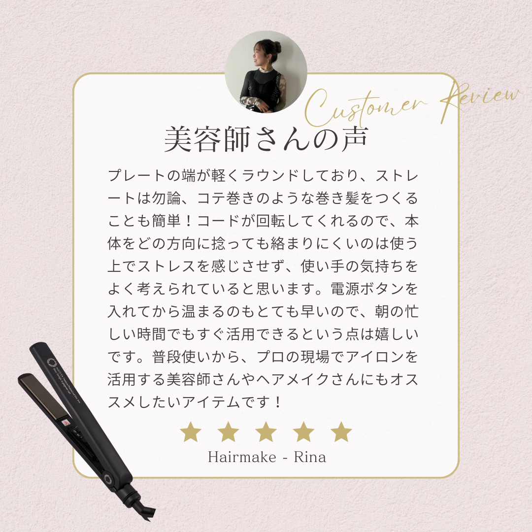 熱伝導の良い、チタニウムプレート搭載のプロフェッショナルヘアアイロン。髪を傷めず、さっと滑らすだけで艶々の髪へ。